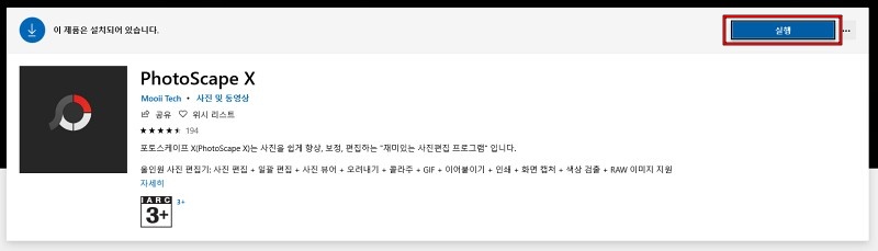 저 같은 경우는 이미 포토스케이프 X가 설치되어 있어서 실행이라고 나오는데, 설치되어 있지 않으면 설치라고 뜰 겁니다. 설치를 클릭해서 포토스케이프 X 설치를 시작합니다. 마이크로소프트 스토어는 별 다른 과정 없이 설치만 누르면 알아서 프로그램을 설치합니다. 안드로이드의 마켓이나 애플의 앱스토어와 비슷한 방식이죠.