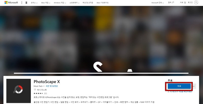 클릭하면 마이크로소프트 스토어의 Photoscape X 페이지로 갑니다. 오른쪽 무료 버튼을 클릭합니다. 그러면 Microsoft Sotre 페이지를 열겠냐고 물어보는데, Microsoft Sotre 열기를 클릭해서 스토어에 어플을 실행합니다.
