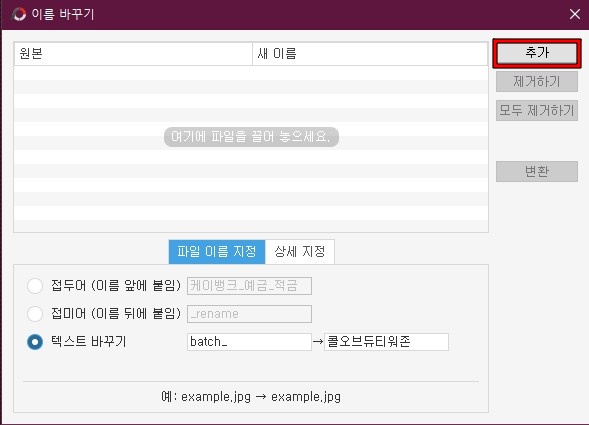 도구에서는 이름 바꾸기 기능을 주로 사용합니다. 블로그에 올리는 이미지의 파일 이름도 중요하다고 생각하기 때문에, 이미지들의 텍스트를 일괄적으로 바꿔서 올리고 있습니다. 추가를 통해 파일들을 추가하고 바꾸고 싶은 텍스트를 입력하면 텍스트의 전체 이름이 바뀝니다. 상세 지정으로 번호를 지정하는 것도 가능합니다.