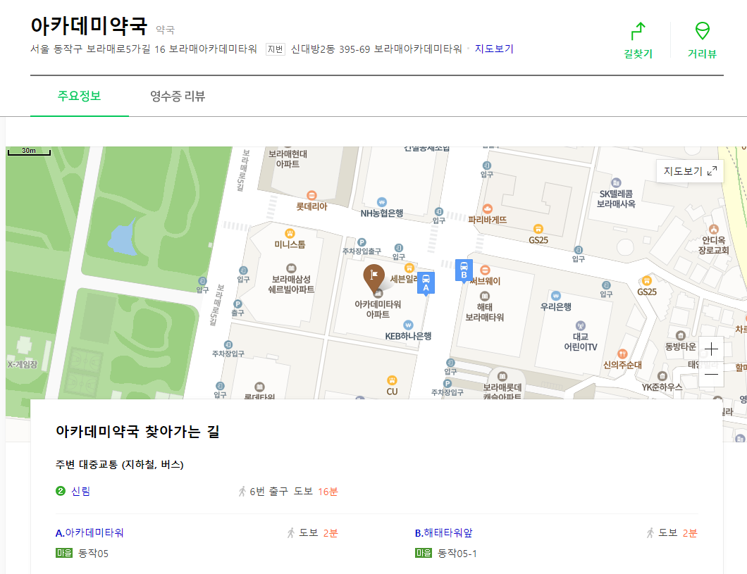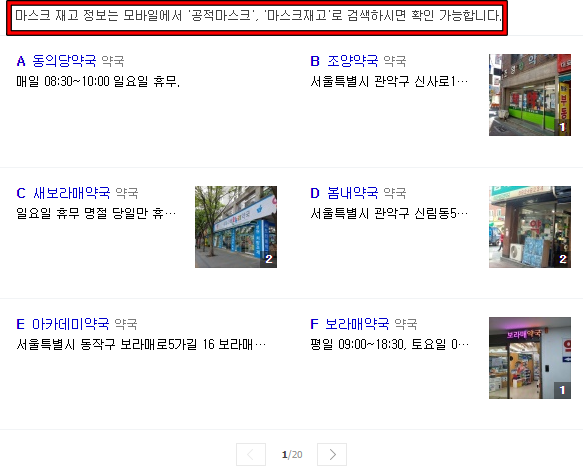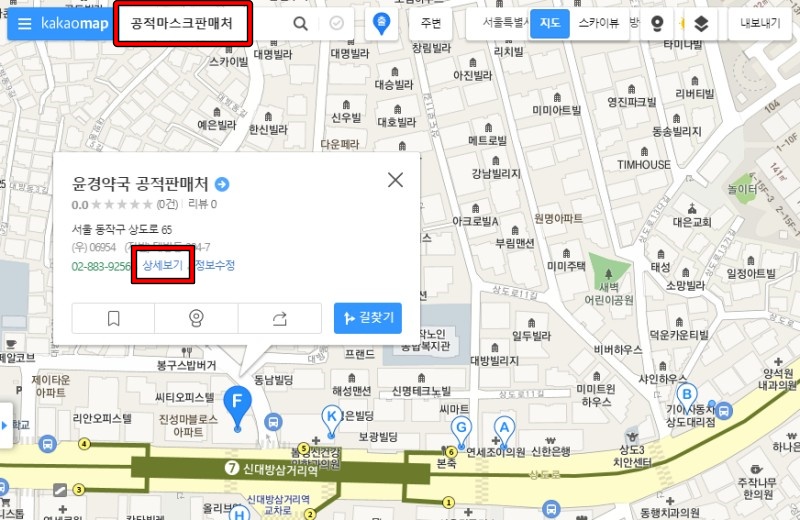 카카오 맵에서 공적 마스크 판매처라고 검색하면 마스크를 판매하는 약국 리스트가 나옵니다. 약국을 클릭하고 상세보기를 클릭하면 마스크 재고를 확인할 수 있습니다.