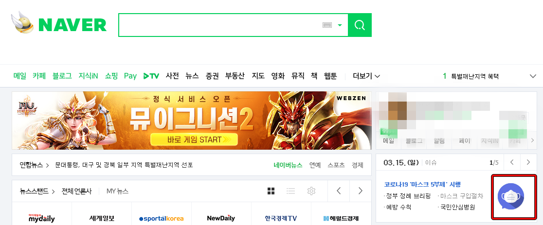 네이버 홈페이지에서 오른쪽에 있는 마스크 아이콘을 클릭합니다.