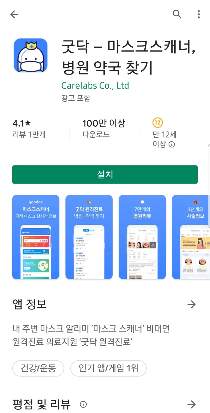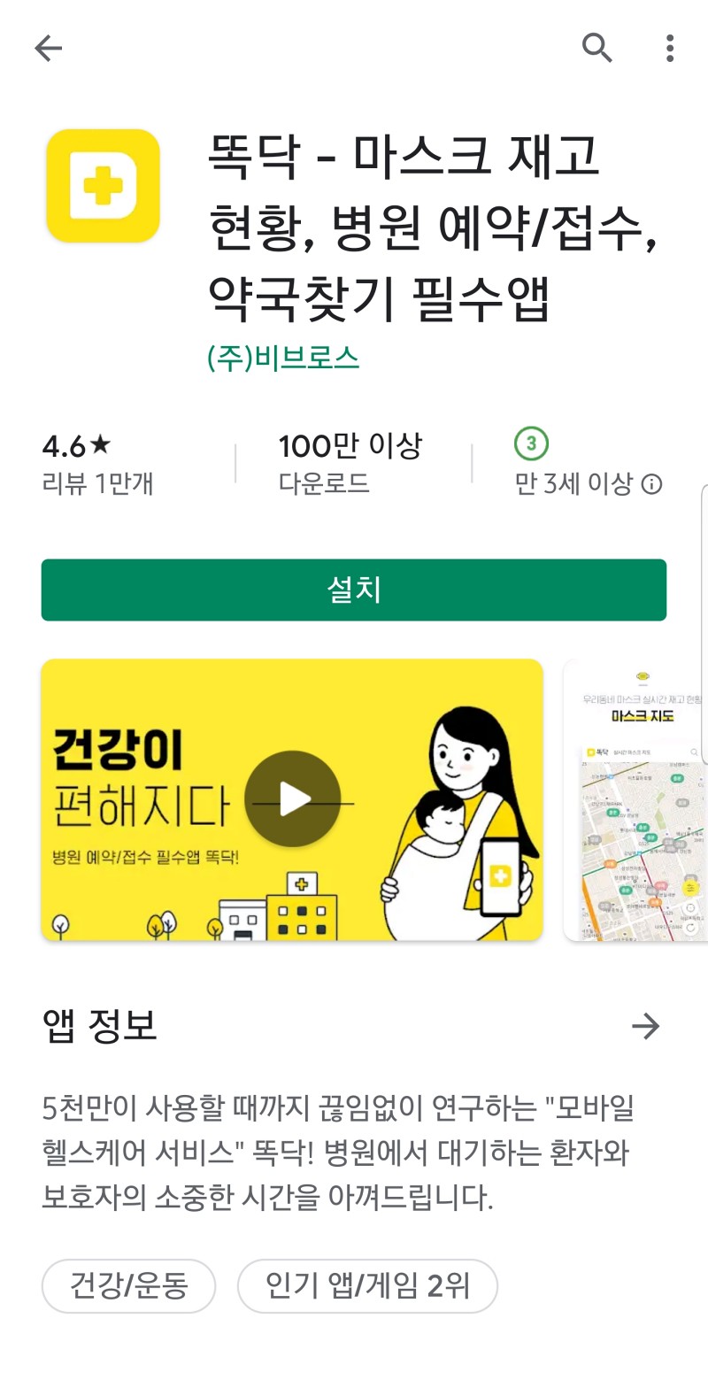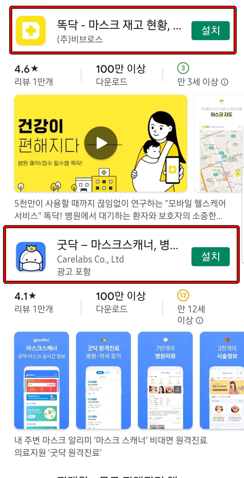 마스크 알리미 말고도 마스크 재고를 확인할 수 있는 어플이 있습니다. 굿닥, 똑닥은 마스크 재고, 현황뿐만 아니라, 병원 예약, 약국 찾기 기능까지 제공합니다.