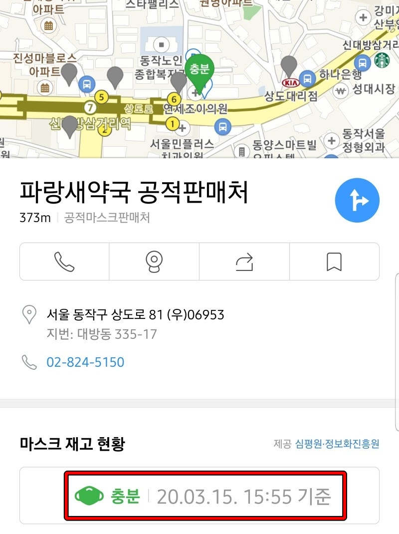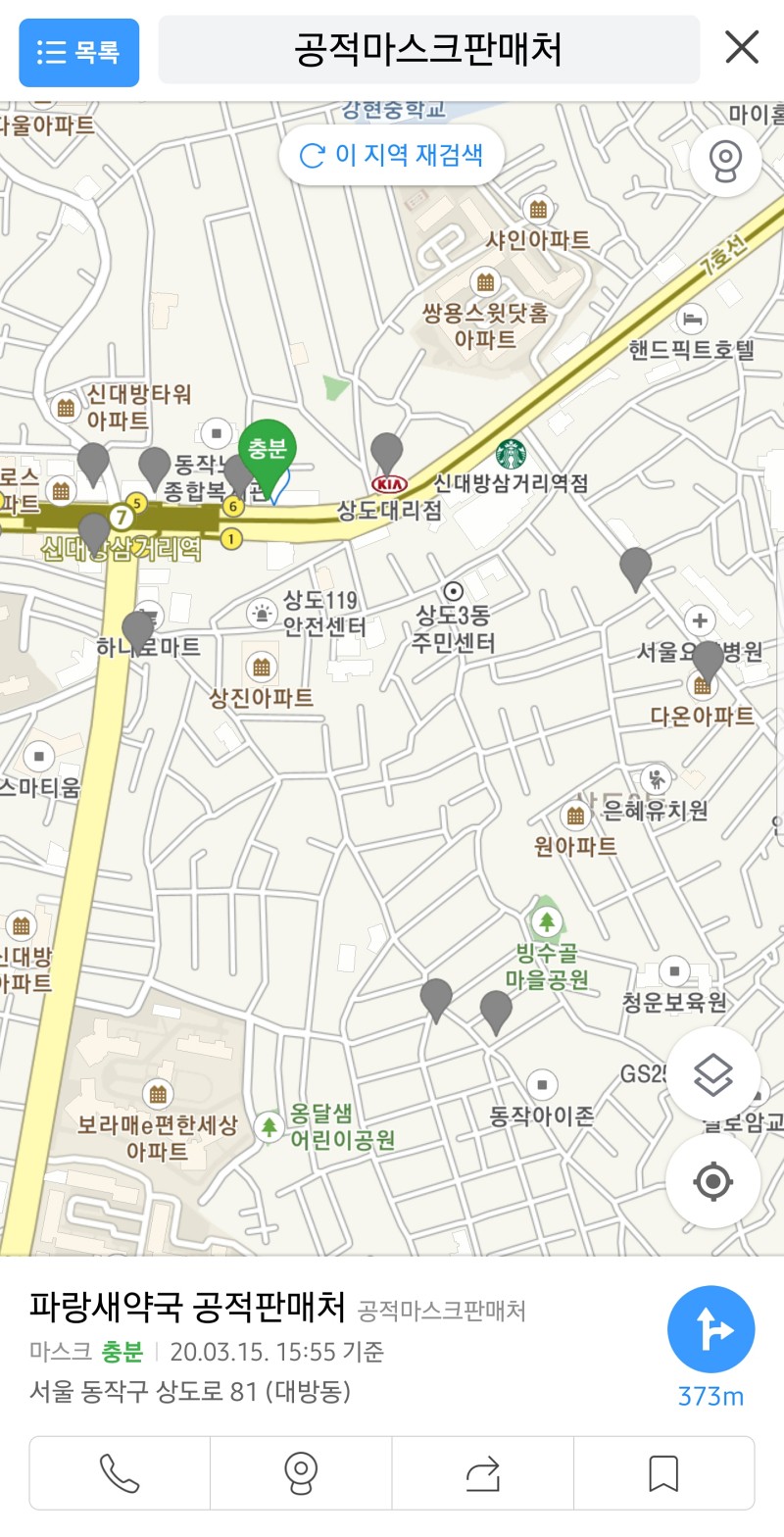 카카오 맵 어플로 공적 마스크 판매처를 검색하면 마스크 알리미처럼 충분, 부족, 없음 같은 상태까지 확인할 수 있습니다.
