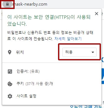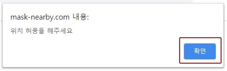 마스크 재고를 확인하려면 위치 허용을 해야 합니다. 확인을 클릭합니다. 만약에 위치 허용이 되지 않는다면, 상단 사이트 주소 왼쪽에 자물쇠를 클릭하면 설정이 나오는데, 위치 란에서 허용으로 바꿔줍니다.