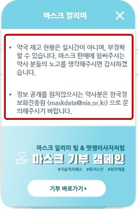 마스크 알리미의 약국 재고 현황은 실시간이 아닙니다. 정보 공개를 원치 않은 약사분들은 공개를 하지 않을 수도 있으니, 마스크알리미에 뜨지 않는 약국도 확인해보시는 게 좋습니다.