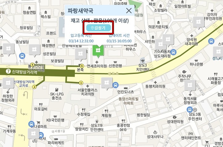 확인하기를 클릭하면 위 이미지와 같이 마스크 재고를 한눈에 확인할 수 있습니다. 회색은 마스크 재고가 없는 거고, 녹색은 마스크 재고가 있는 것입니다. 길 찾기를 클릭하면 카카오 맵이 실행되면서 길 찾기 메뉴가 나옵니다.
