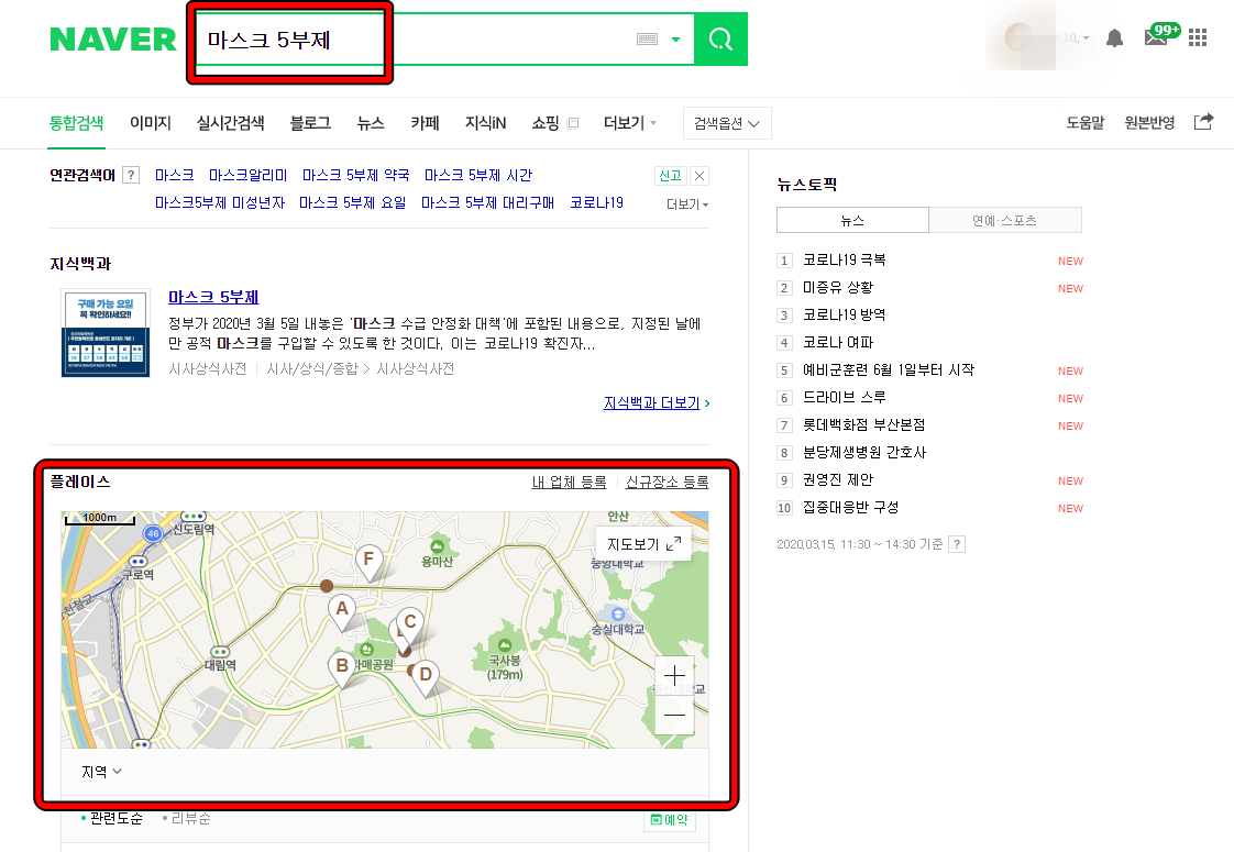 클릭하면 마스크 5부제라는 검색어로 나온 검색 화면이 나오는데, 플레이스를 통해 마스크 판매처를 확인할 수 있습니다.