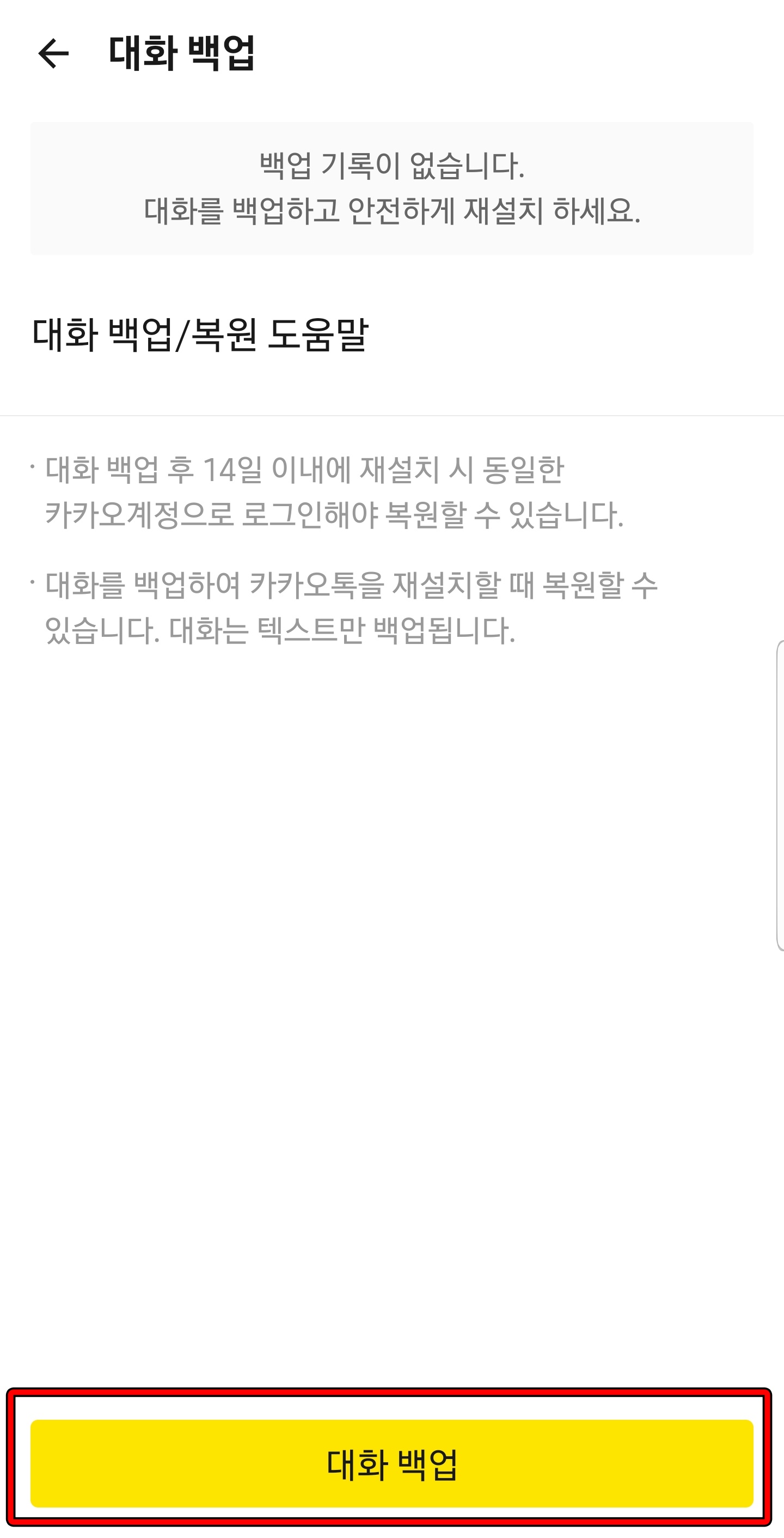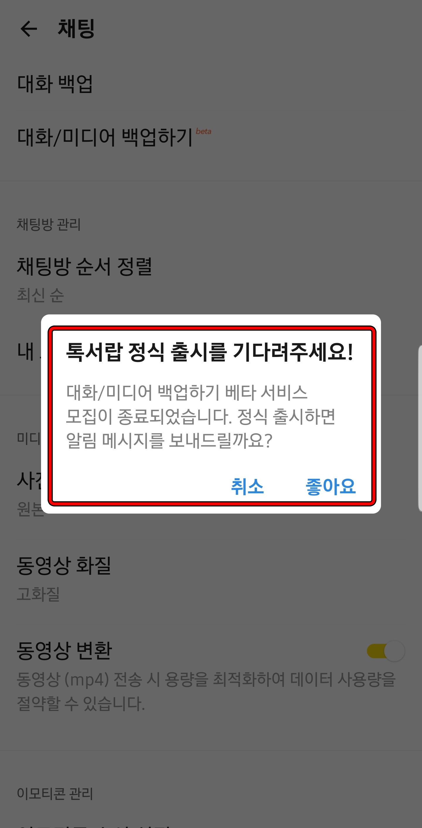 채팅에 가면 맨 첫번째에 대화 백업이 있습니다. 클릭합니다. 바로 밑에는 이번에 새로 생긴 대화/미디어 백업하기 버튼이 있습니다. 베타 버전인데, 아직은 이용할 수 없습니다. 클릭하면 나중에 이용할 때 사용하겠냐는 메시지가 나오는데, 알겠다고 하면, 추후에 알려줍니다. 대화 백업 항목에는 대화 백업 버튼이 있습니다. 클릭합니다.