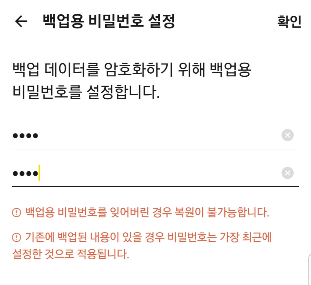 클릭하면 백업용 비밀번호를 설정해야 합니다. 비밀번호는 최소 4자 이상을 입력해야 합니다. 백업용 비밀번호를 잊어버린 경우에는 복원이 불가능하니 주의하시기 바랍니다. 기존에 백업된 내용 있을 경우에는 비밀번호는 가장 최근에 설정한 것으로 적용됩니다.
