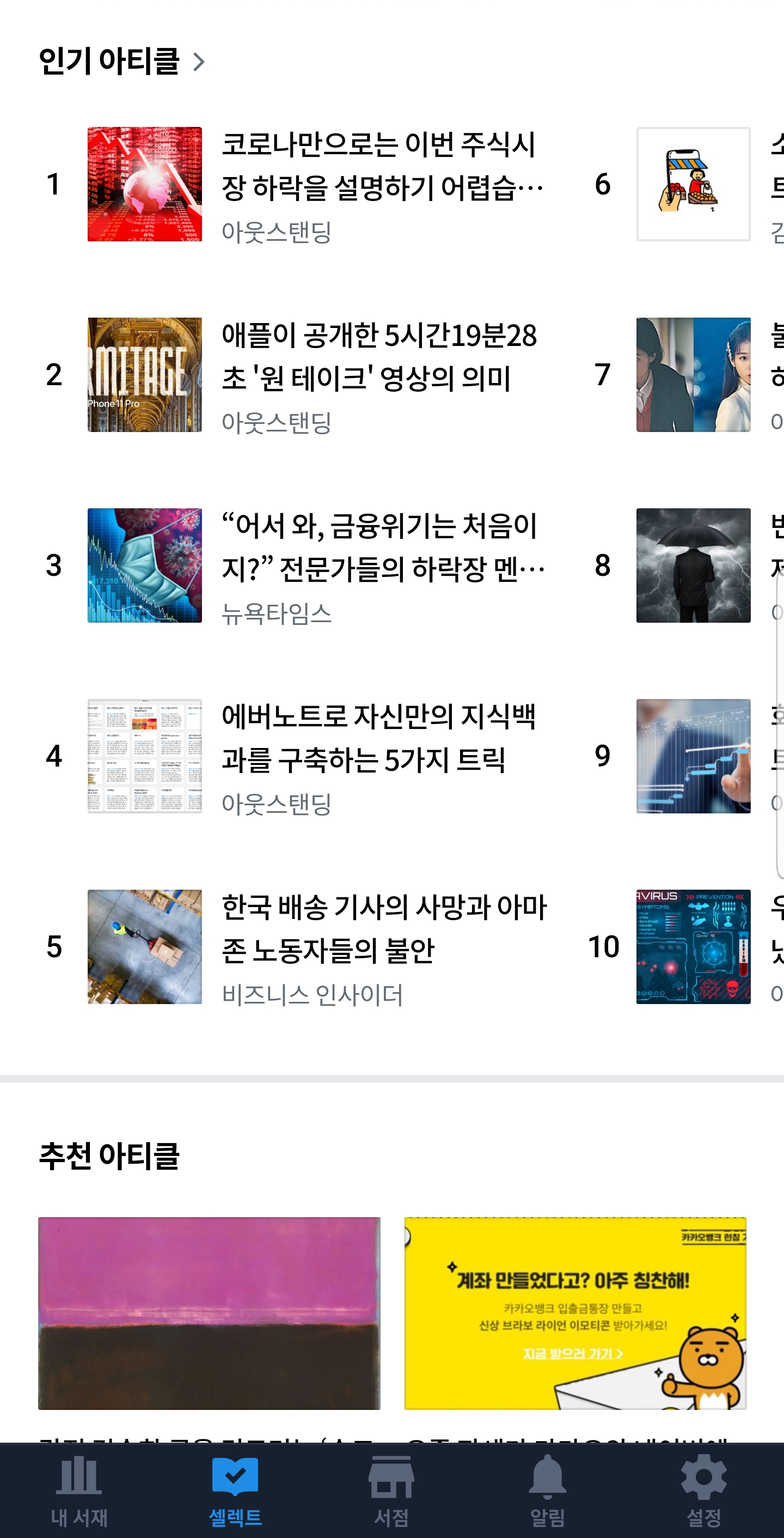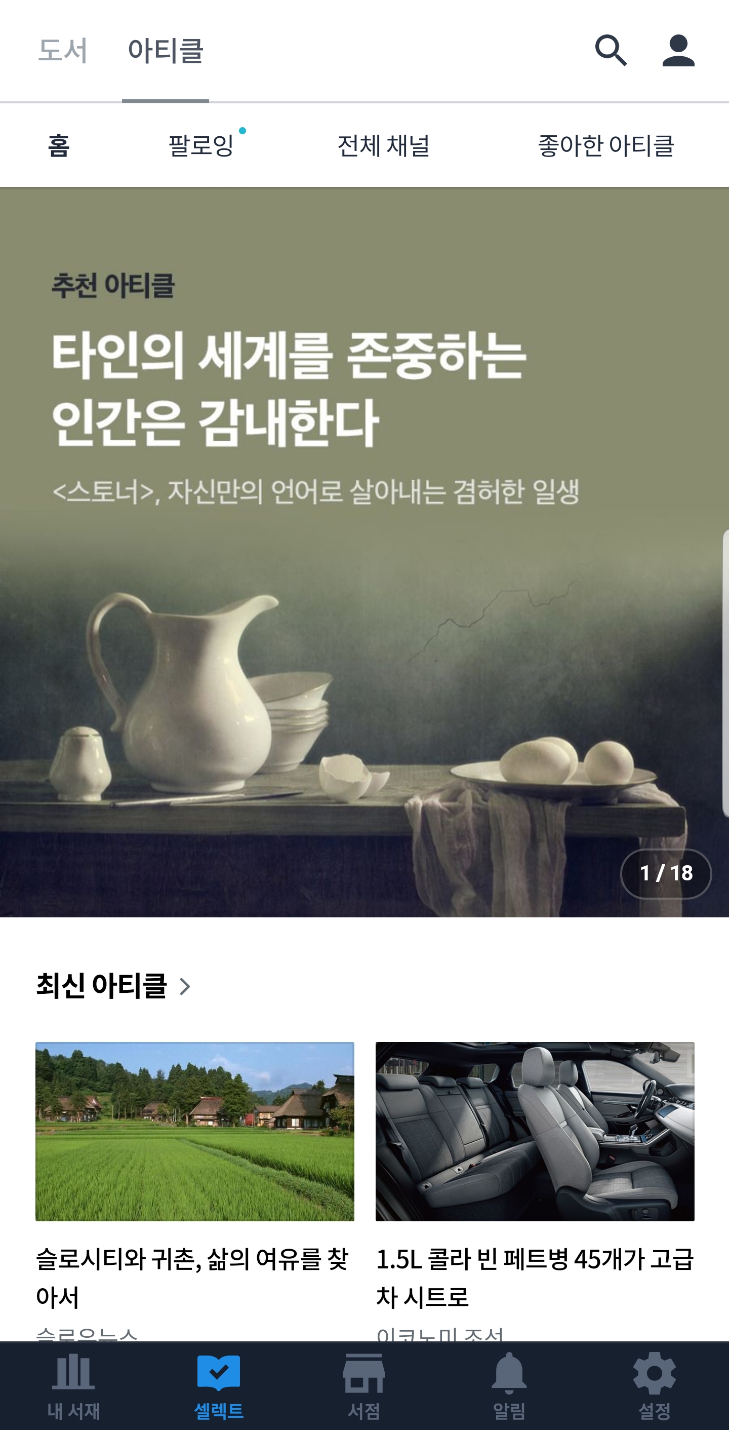 최근에는 리디북스 아티클이라는 것도 생겼습니다. 언론사, 매체 등에서 제공하는 읽을거리를 제공하는 건데, 한눈에 볼 수 있고, 관심 있는 저자, 언론사를 구독하는 것도 가능해서 심심할 때 읽고 있습니다. 워낙 광고성 기사들이 많아서 피곤한데, 아티클에는 그런 게 없어서 좋은 것 같습니다.