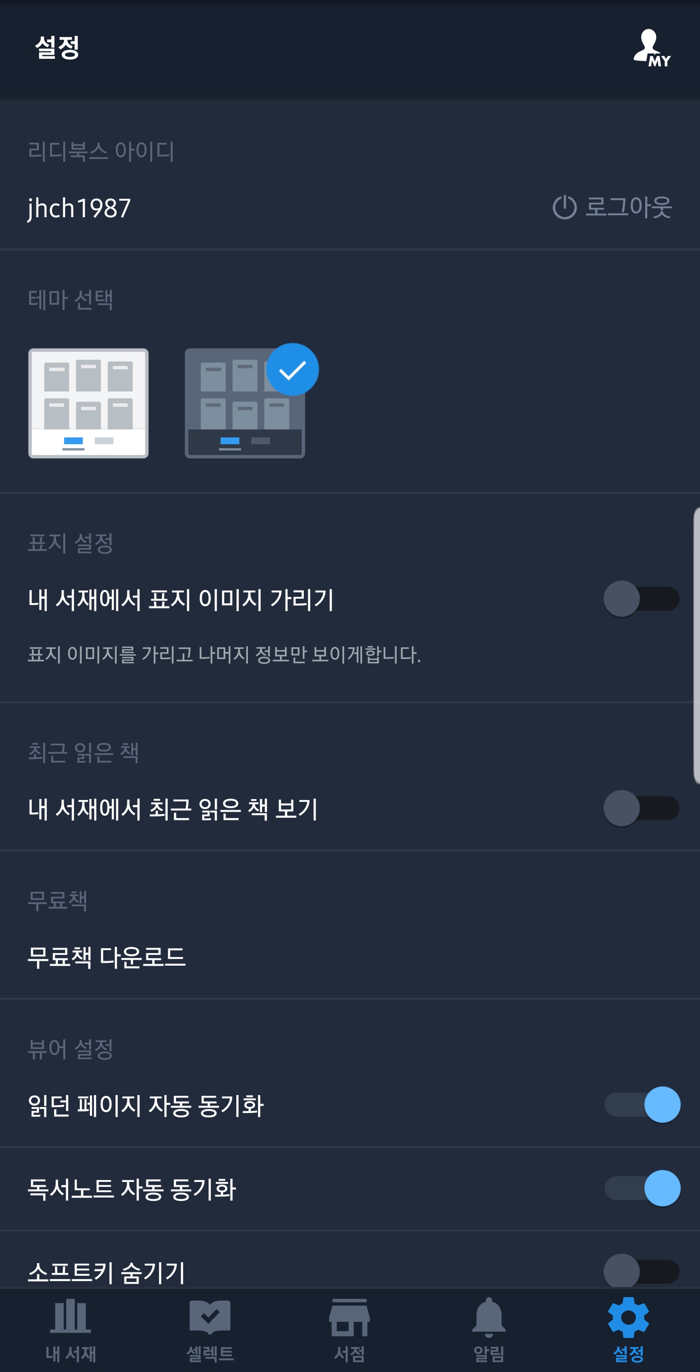 리디북스 설정에서는 리디북스의 거의 대부분의 설정을 할 수 있습니다. 아이디 로그인, 테마, 표지 설정, 최근 읽은 책, 무료 책 다운로드, 뷰어 설정, 등 리디북스 어플의 디테일한 설정이 가능하죠. 저는 다크 테마로 이용 중인데, 오래 봐도 눈이 아프지 않아서 좋습니다.