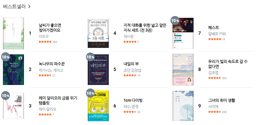 리디북스 홈페이지에는 사람들이 지금 많이 읽고 있는 책이라 고해서 현재 리디북스 어플을 통해 사람들이 어떤 책을 읽고 있는지 볼 수 있습니다. 최대 9권까지 볼 수 있습니다. 이 리스트를 보면, 요즘 사람들이 어떤 책을 많이 읽고 있는지 대략적으로나마 알 수 있습니다. 시작의 기술은 저번에 유튜브에 나온 책인데, 나중에 한번 읽어야겠습니다.