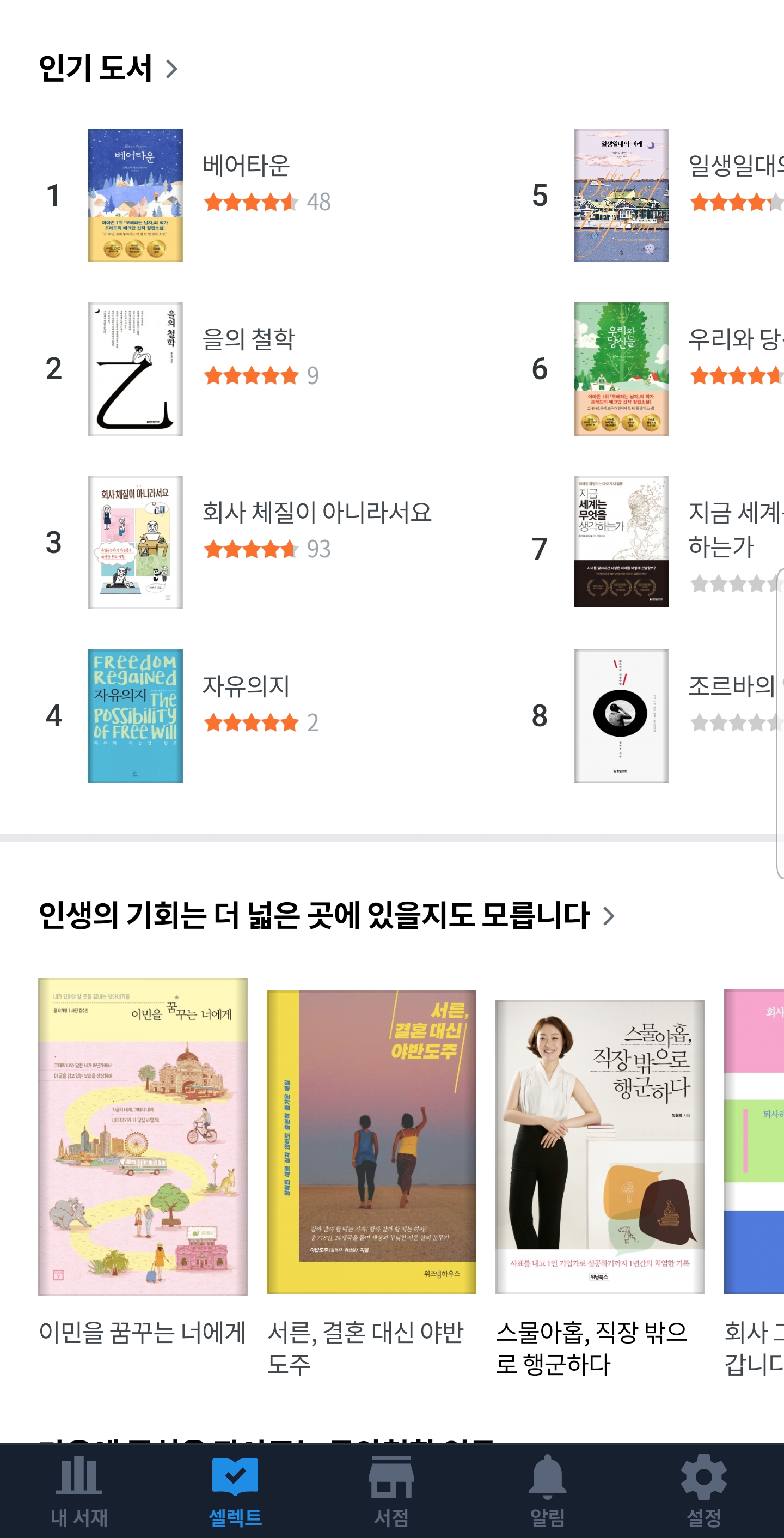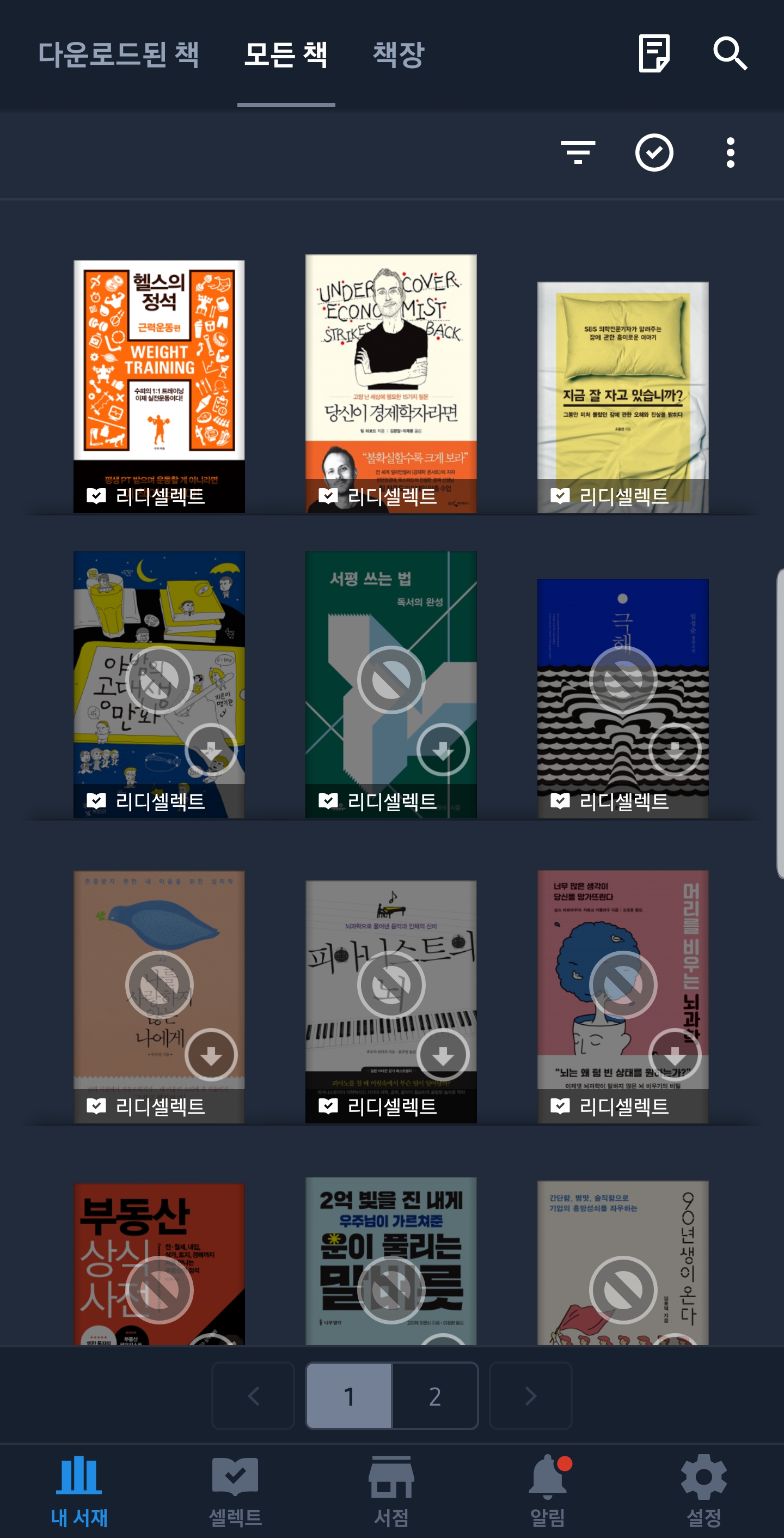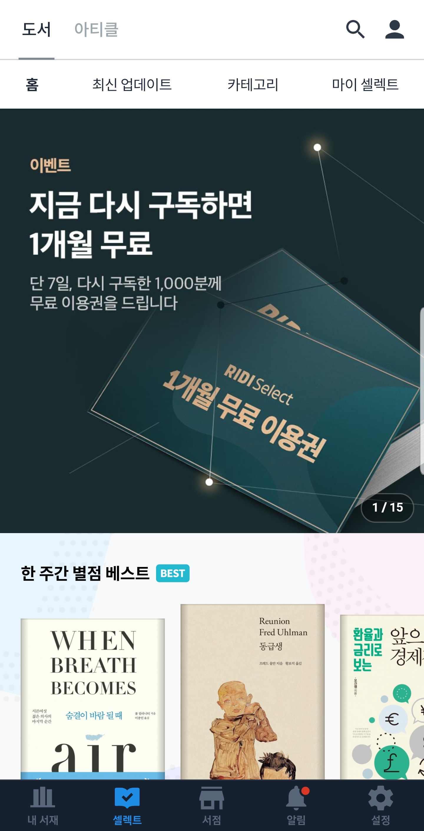 리디북스 어플의 하단 탭은 내 서재, 셀렉트, 서검, 알림, 그리고 설정으로 구성되어 있습니다. 셀렉트는 구독 서비스인 리디 셀렉트를 통해 구입 가능합니다. 알림은 리디북스의 알림을 한눈에 보여줍니다. 서점은 리디북스 서점으로 이동하는데, 리디북스 어플 내에서가 아닌, 외부 브라우저를 통해 이동합니다.