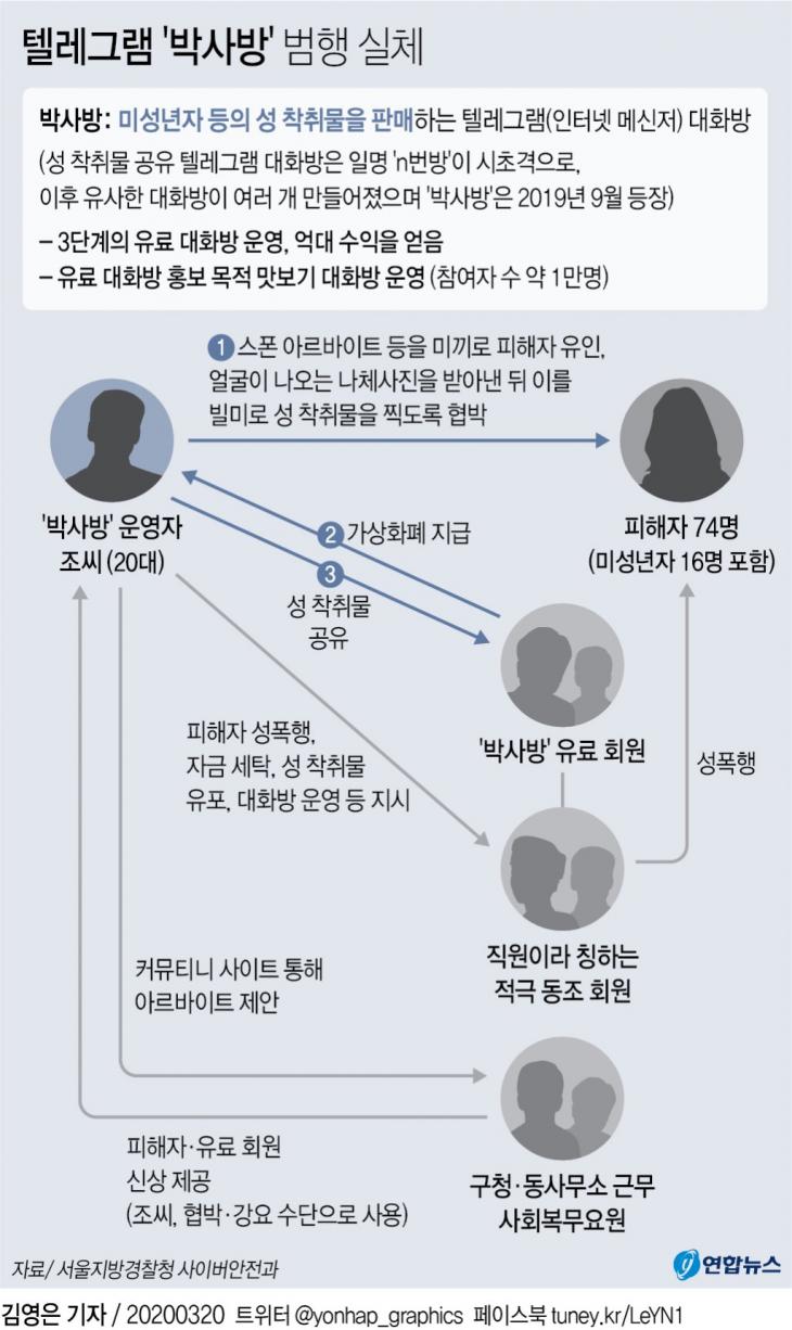 성착취물이 유통되는 텔레그램 n번방은 2019년 초부터 급격히 늘기 시작하여 수십 개에 이릅니다. '여교사방', '여군방', '여경방', '여간호사방', '여중생방', '여아방' 등 가해자의 취향에 따라 방이 지속적으로 생기고 사라졌다.# 디시인사이드 국내야구 갤러리, 수능 갤러리 등의 남초 사이트에서는 대부분이 낚시성 글이지만 링크를 거래하거나 공유한다는 글이 올라오기도 했다.# 이용자들이 암호화폐로 거래를 하고 텔레그램은 서버를 국외에 두고 이용자 정보를 공개하지 않아 수사에 어려움이 컸다.