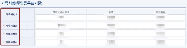 가족사항 입력항목입니다. 세대주를 제외한 가족 정보를 입력합니다. 주민등록표 기준이고, 최대 5명까지 입력 가능합니다. 가족사항을 입력하고 추가를 클릭하면 항목이 늘어나서 다른 가족 구성원 입력이 가능합니다.