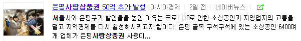 서울사랑상품권을 검색했을 시에 나오는 관련뉴스들은 다음과 같았습니다. 서울시는 서울사랑상품권을 800억원어치를 추가로 푼다고 합니다. 서울시에서 제공하는 재난지원금도 상품권으로 지급하게 되죠. 은평구, 구로구 같은 지역구들도 자체 상품권을 발행하고 있습니다. 은평사랑상품권은 50억원을 추가 발행하고, 강서두고 서울강서상품권을 출시합니다. 대부분의 상품권은 10%~20%할인가로 제공하며, 구내 업소에서 사용 가능합니다.