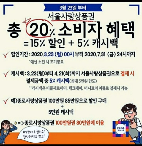 서울사랑상품권의 구매 가능 권종은 1만원, 5만원, 10만원 3종류로 구매 가능합니다. 해당 자치구 내에서 구매한 상품권은 해당 자치구 내에서만 사용이 가능합니다. 서울사랑상품권의 상시할인율은 7%인데 코로나 특별대책으로 2020년 3월23일부터 7월 말까지는 15% 할인에 5% 추가 캐시백을 실시하고 있습니다. 서울사랑상품권의 할인률이 어마어마합니다.