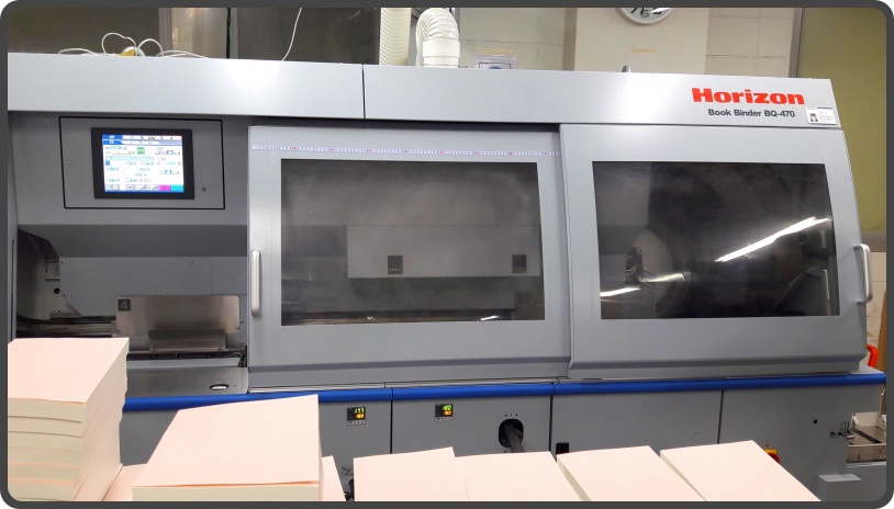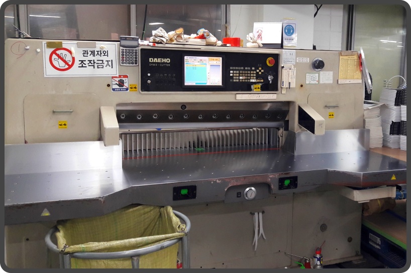 ▲ 재단기와 제본기입니다. 저 재단기는 대호라는 회사에서 만든 제품인데, 국산이고 품질이 좋아 많은 인쇄업체에서 쓰고 있습니다. 오른쪽에 있는 제본기는 호라이즌이라는 회사에서 만들었습니다. 일본에서 만들었고, 여러 업체에서 많이 쓰죠.