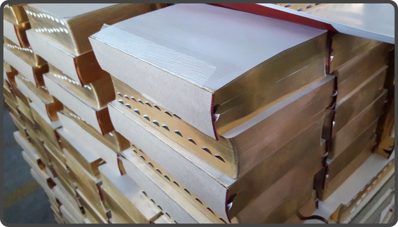 ▲ 제본을 하면 이런 식으로 책이 나옵니다. 이걸 재단기로 책의 오른쪽, 아래, 위 재단을 치면, 우리가 흔히 보는 책의 모양이 나오죠.