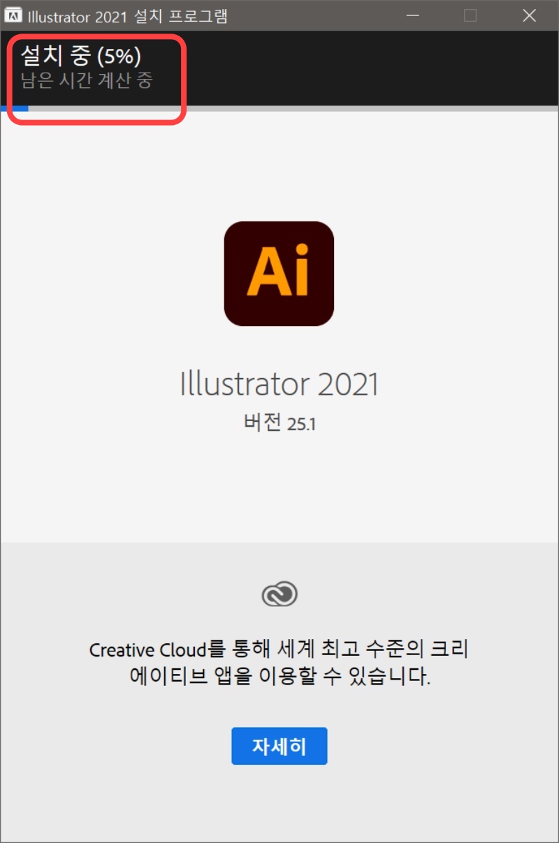 설치 압축을 푸는 중입니다. 시간은 그리 오래 걸리지 않습니다. 압축이 풀리면 일러스트 2021 설치 프로그램이 실행됩니다.