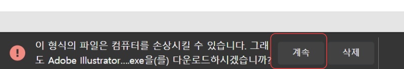 이 형식의 파일은 컴퓨터를 손상시킬 수 있습니다. 그래도 Adobe Illustrator.....exe을(를) 다운로드하겠습니까? 라는 메시지가 나오면 계속을 클릭하시면 다운받을 수 있습니다.