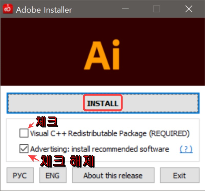 설치 프로그램 창입니다. 위의 Visual C++만 체크하고 밑의 Advertising:... 은 체크를 해제 합니다. 이후 INSTALL을 클릭해서 설치를 진행합니다.