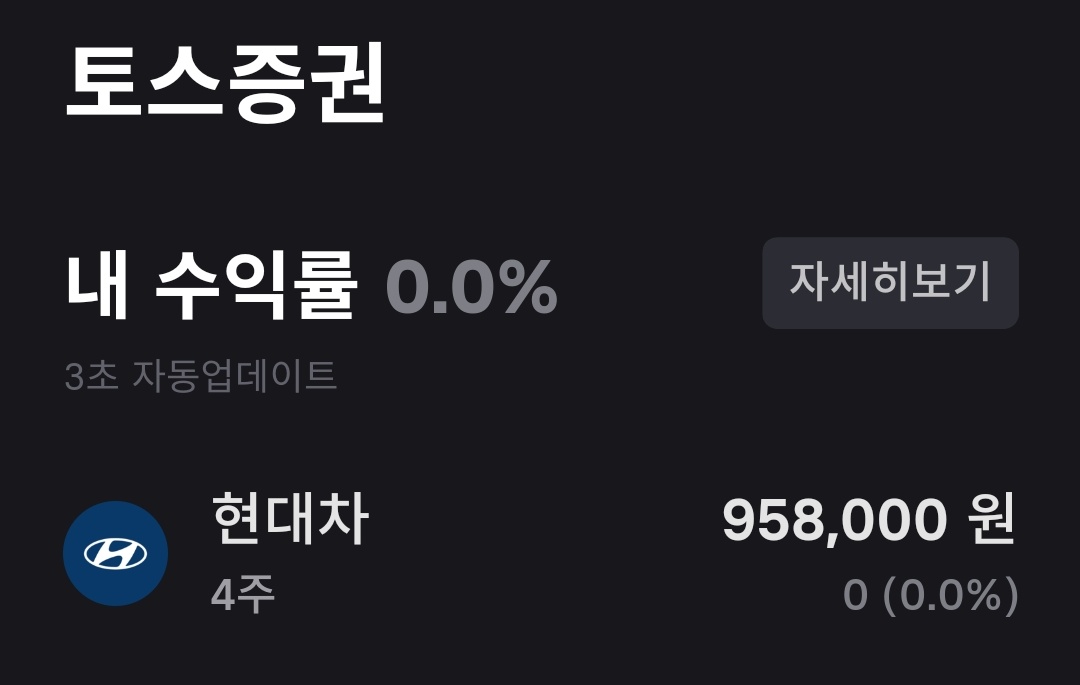 현대차 매수가 완료되었습니다. 4주 매수했고, 금액은 95만 8천원이 나왔네요. 수수료는 6개월동안 무료라, 매수 수수료는 나오지 않았습니다. 토스증권의 수수료는 0.015%이고, 주식 매수, 매도시에 부과된다고 합니다.