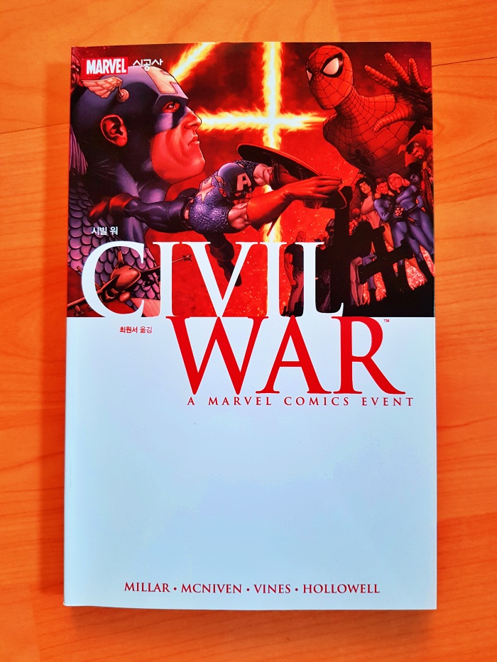행사장에서 싸게 구입한 책 2권입니다. 하가시노 게이고의 [그대 눈동자에 건배]는 정가 14,000원을 9,600원에 구매했고, 마블 [CIVIL WAR]는 10% 할인 적용해서 1만 2천 원대에 구입했습니다.