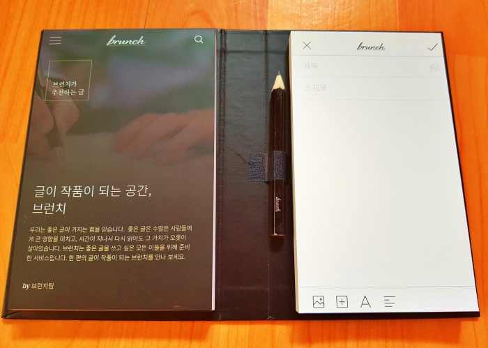 이렇게 되어 있습니다. 왼쪽은 브런치 작가들의 글, 오른쪽은 브런치 앱의 레이아웃과 흡사한 메모지가 있습니다. 꽂혀있는 연필에도 브런치 로고가 새겨져 있군요.