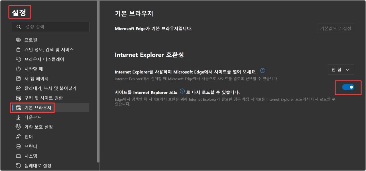 설정에서 기본 브라우저 로 이동합니다. 사이트를 Internet Explorer 모드로 다시 로드할 수 있습니다. 에 체크합니다. 위에 있는 메뉴는 신경쓰지 않으셔도 됩니다.