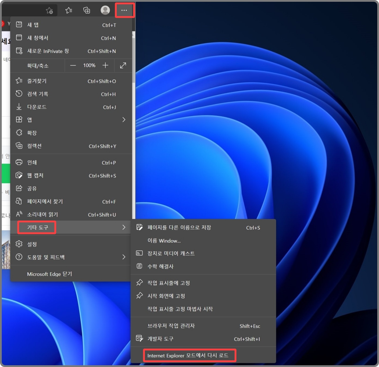 이제 다시 오른쪽 점 3개 -> 기타 도구 -> Internet Explorer 모드에서 다시 로드 를 실행합니다. 이제 해당 페이지는 인터넷 익스플로어 모드로 다시 열립니다.