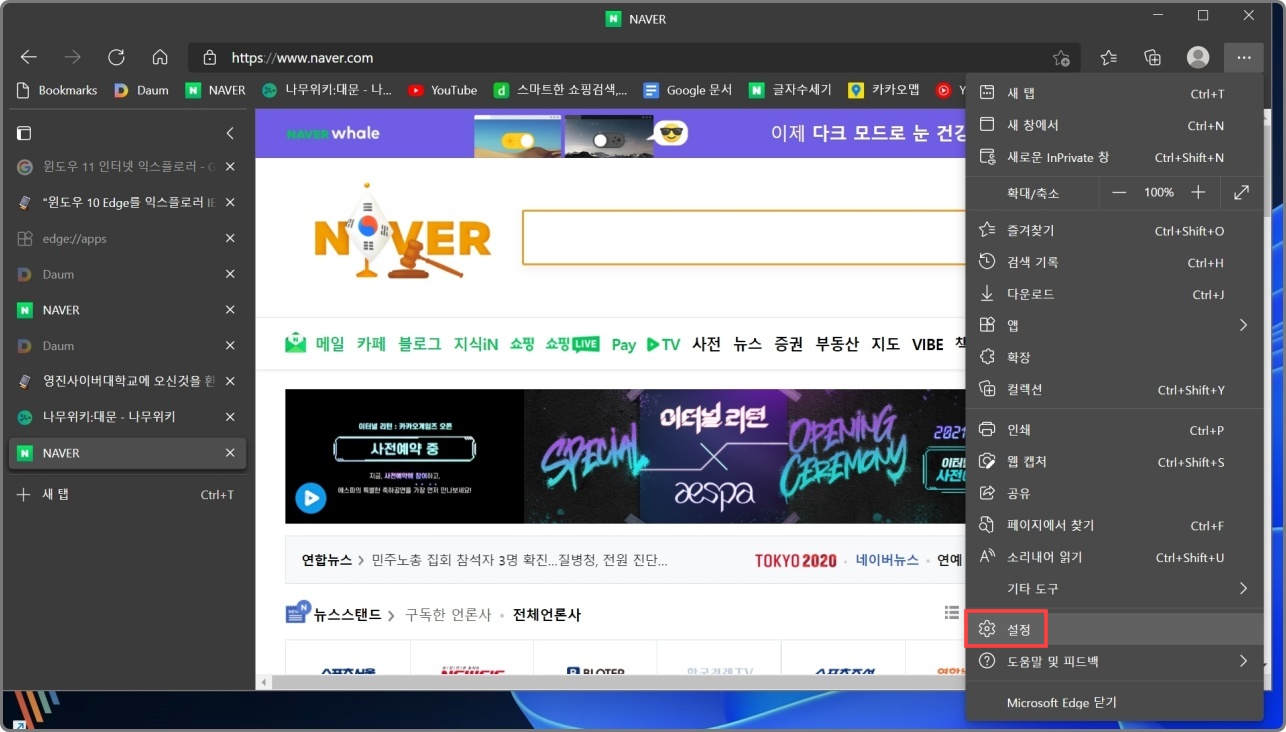엣지 브라우저를 실행하고 우측 상단에 있는 점 3개 를 누릅니다. 이후 설정 으로 이동합니다.