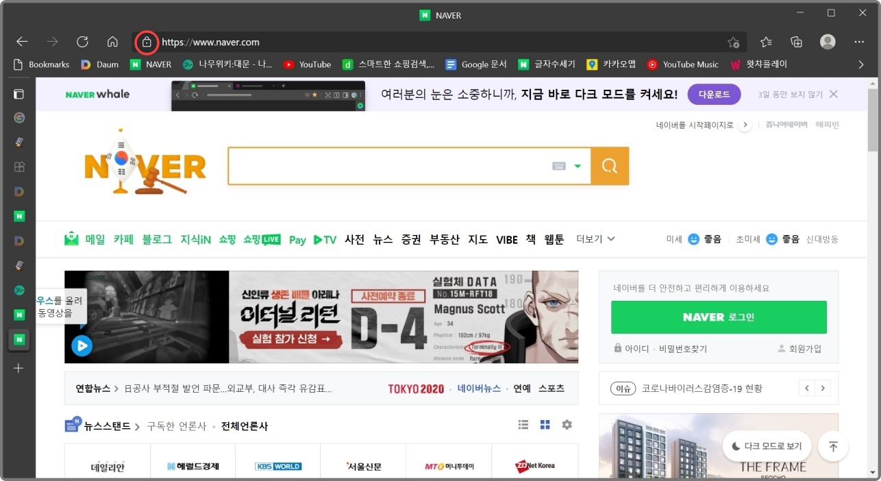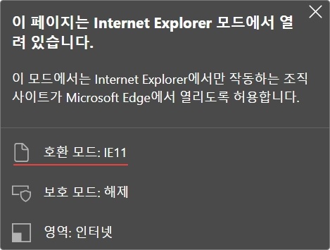 주소창 왼쪽에 인터넷 익스플로어 아이콘이 있는 걸 확인할 수 있습니다. 하단에는 Internet Explorer 모드로 로드되었다는 메시지가 떴습니다. 익스플로어 버전은 11이고, 보호모드는 해제 된 상태입니다.