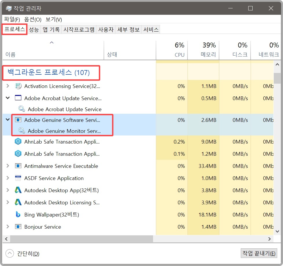 Shift + Crtl + Esc 키를 눌러 작업 관리자를 실행합니다. 프로세스 탭에서 백그라운드 프로세스에 있는 프로그램 2개를 작업 끝내기 합니다.(마우스 오른쪽 클릭)
