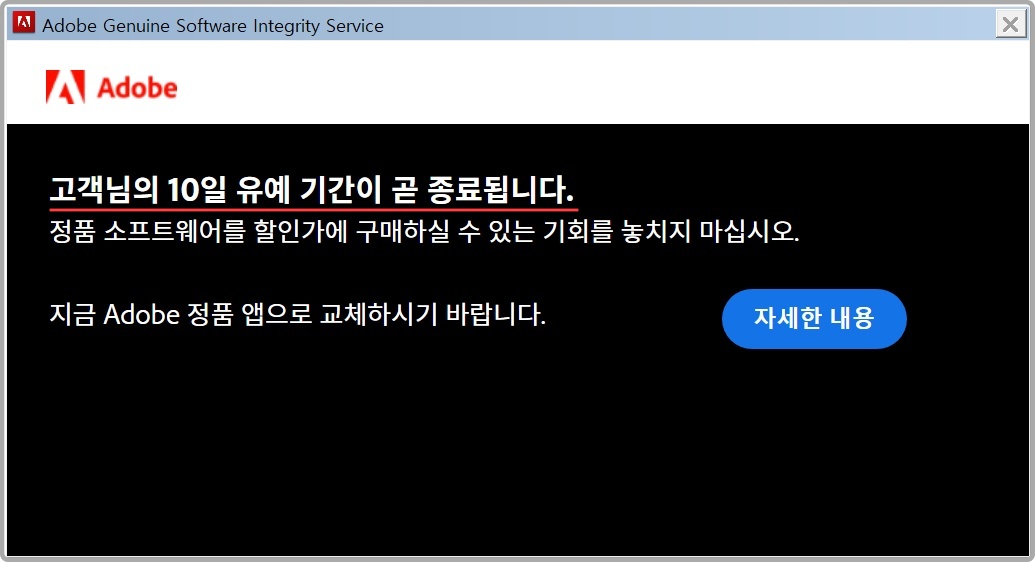 어도비 프로그램 크랙 버전이나 리팩 버전을 쓰다 보면 종종 정품 인증이 풀리거나 정품 정책이 강화되어서 어도비 관련 프로그램을 실행하다가 고객님의 10일 유예 기간이 곧 종료됩니다 메시지를 마주하곤 합니다.