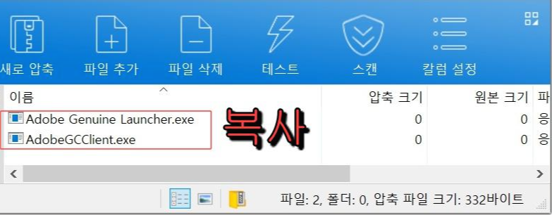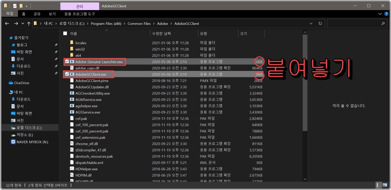 아까 갔던 C:\Program Files (x86)\Common Files\Adobe\AdobeGCClient 로 다시 이동한 후 2개 파일을 붙여넣기 합니다. 붙여넣은 파일 크기가 0인지 확인합니다. 이후 컴퓨터를 재시작 합니다.