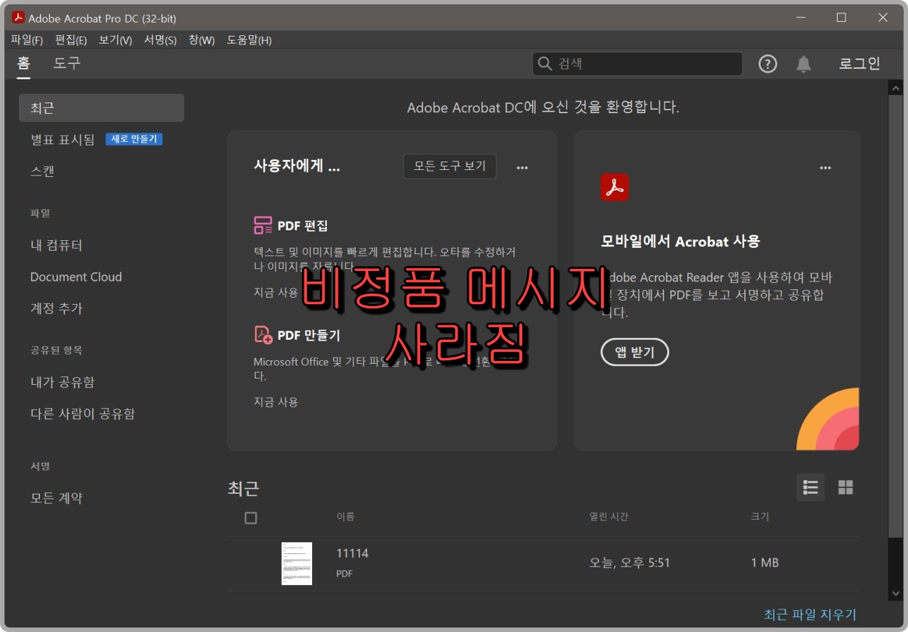재부팅 후 Adobe 프로그램을 실행해 봅니다. 비정품 메시지가 뜨지 않는 것을 확인할 수 있습니다.