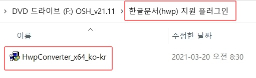 OSH 디스크에는 워드에서 한글 문서인 .hwp를 열 수 있는 플러그인도 있습니다. 한글문서(hwp) 지원 플러그인 폴더에 있는 HwpConverter_x64_ko-kr 을 설치하시면 됩니다.