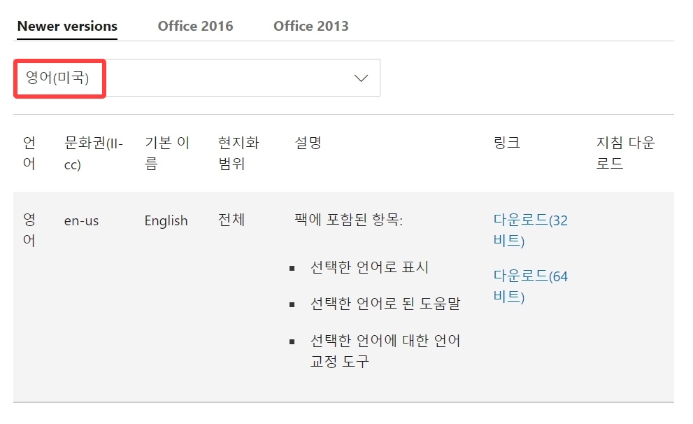 클릭하고 스크롤을 조금만 내리면 언어 다운로드를 볼 수 있습니다. 오피스 2021은 Newer versions 탭에서 다운받을 수 있습니다. 영어 뿐만 아니라, 다른 언어도 받을 수 있습니다. 오피스 2021을 영어로 설치했을 경우, 한국어 언어 팩을 다운받아서 한국어 오피스 2021로 설치할 수도 있습니다.