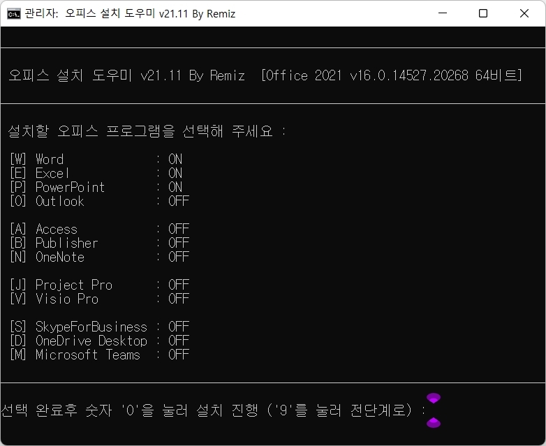 실행 화면입니다. 오피스 2021을 설치할 것이므로 MS오피스 2021을 ON 으로 설정하고 숫자 0을 누릅니다.
