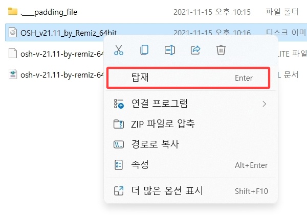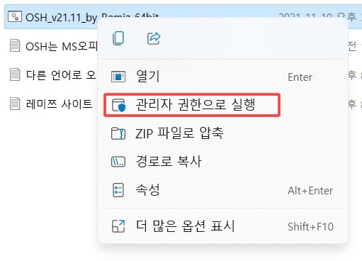 그리고 드라이브 안에 있는 OSH_v21.11_by_Remiz_64bit 를 관리자 권한으로 실행 합니다.