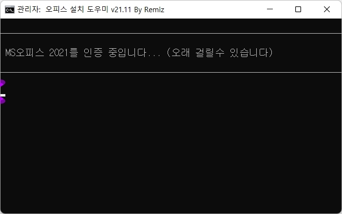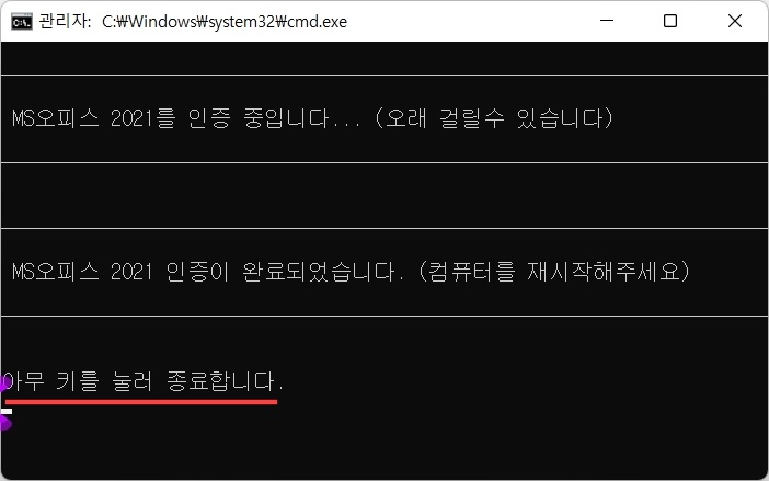 인증은 오래 걸리지 않습니다. MS오피스 2021 인증까지 완료하면 오피스 2021 설치는 완료됩니다. 아무키나 눌러 종료한 후 컴퓨터를 재시작합니다.