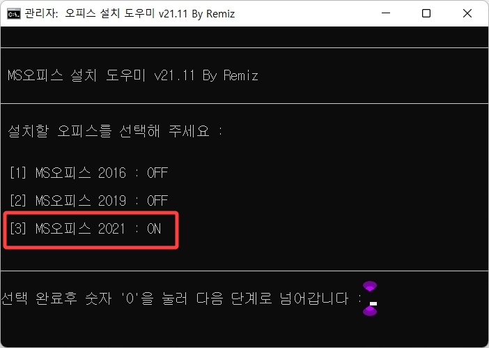 실행 화면입니다. 오피스 2021을 설치할 것이므로 MS오피스 2021을 ON 으로 설정하고 숫자 0을 누릅니다.