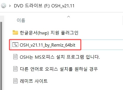 윈도우 11이 64비트밖에 없어서 오피스 2021 64비트 기준으로 설명하겠습니다. 다운받은 OSH_v21.11_by_Remiz_64bit.iso 파일을 탑재 합니다.