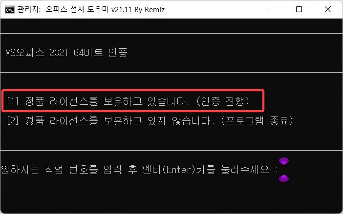 설치가 끝나면 MS오피스 2021 인증을 진행합니다. 정품 라이선스를 보유하고 있다면 1번을 눌러 인증을 진행합니다. 만약 오피스 2021 정품 라이선스가 없다면 아래 링크로 구매를 진행합니다. 정품 사용을 권장하는 이유는 상업적으로 사용(특히 회사)하다 적발시 고가의 MS프로그램을 구매해야 하기 때문입니다.