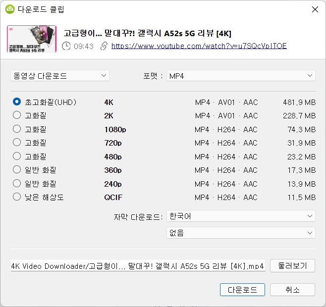 그리고 유튜브 자막도 SRT 방식으로 추출 가능하고, 최대 8K영상으로도 다운받을 수 있는 게 4K Video Downloader의 큰 장점입니다.