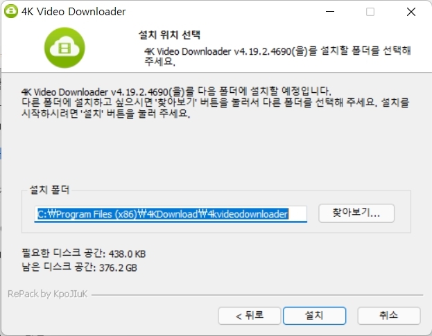 OK를 클릭하고 다음 을 클릭한 후, 설치 를 클릭하면 4K Video Downloader 설치가 시작됩니다. 설치가 끝나면 프로그램을 실행합니다. 정품인증은 되어 있기 때문에, 문제없이 모든 기능을 이용할 수 있습니다.