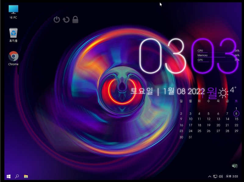 테마는 제작자분이 퍼플을 기본으로 한 테마로 만드셨습니다. 바탕화면에는 시간과 날짜 날씨가 실시간으로 보여줍니다. 그리고 전원 새로고침도 바탕화면 내에 있습니다.
