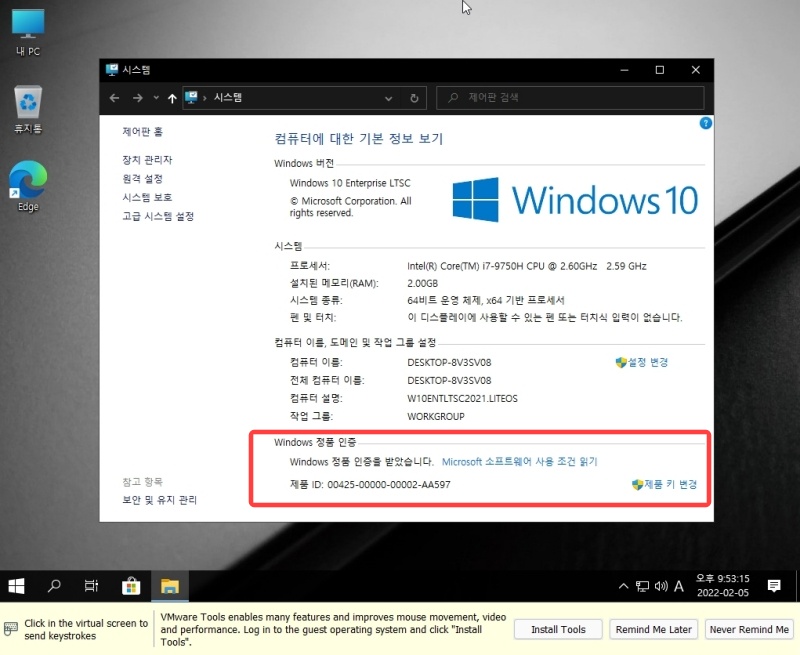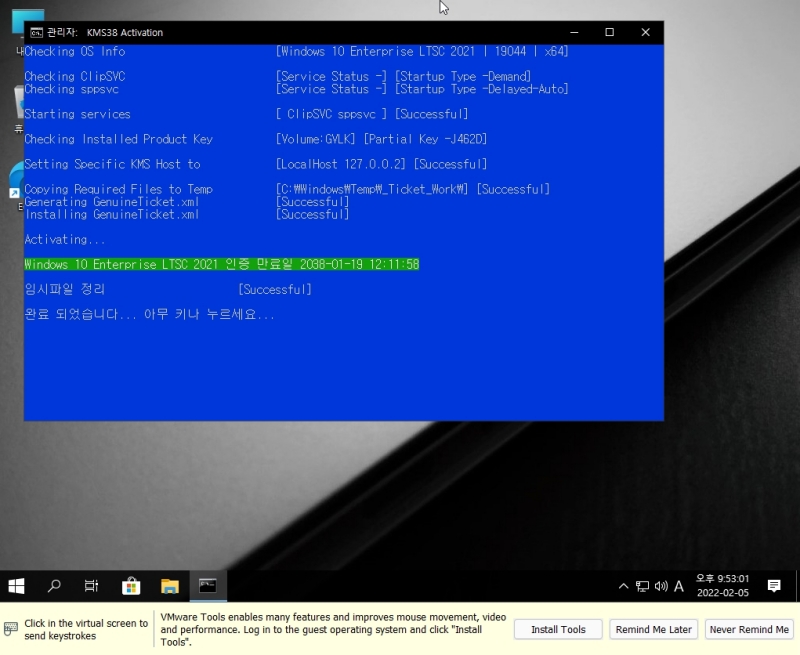 클릭하면 cmd 창이 뜨면서 자동으로 윈도우 10 인증을 완료합니다. 인증이 끝나고 시스템 창에 가보면 windows 10 정품 인증이 자동으로 되어 있는 걸 확인할 수 있습니다.