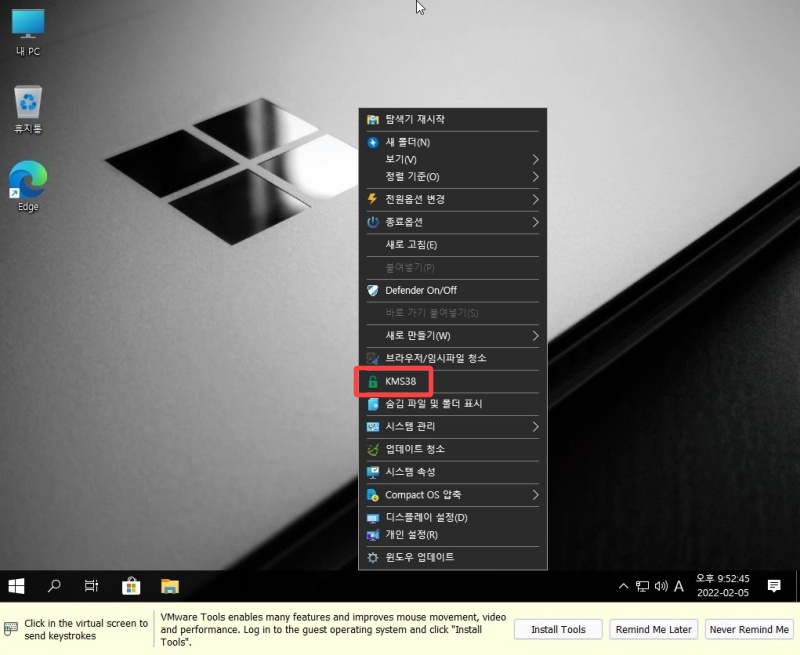 처음 윈도우 10을 실행하면 위 스샷과 같이 라이선스 이미지가 뜹니다. 윈도우 10 정품 키가 있는 분들은 설정에서 윈도우 10 라이선스 인증을 하시면 됩니다. 라이선스 없이 윈도우 10 을 사용하고 싶다면, 마우스 오른쪽->KMS38 을 클릭합니다.